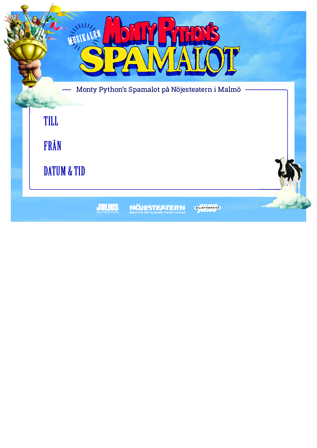 Året var 2010 och Spamalot gjorde Nöjesteaterpremiär med en cast bestående av landets främsta humorister: Johan Wester, Johan Glans, Adde Malmberg, Bertram Heribertson, Anki Albertsson (senare Nina Söderquist), Kim Sulocki, Robert Rydberg, Mattias Linderoth och Anders Jansson.